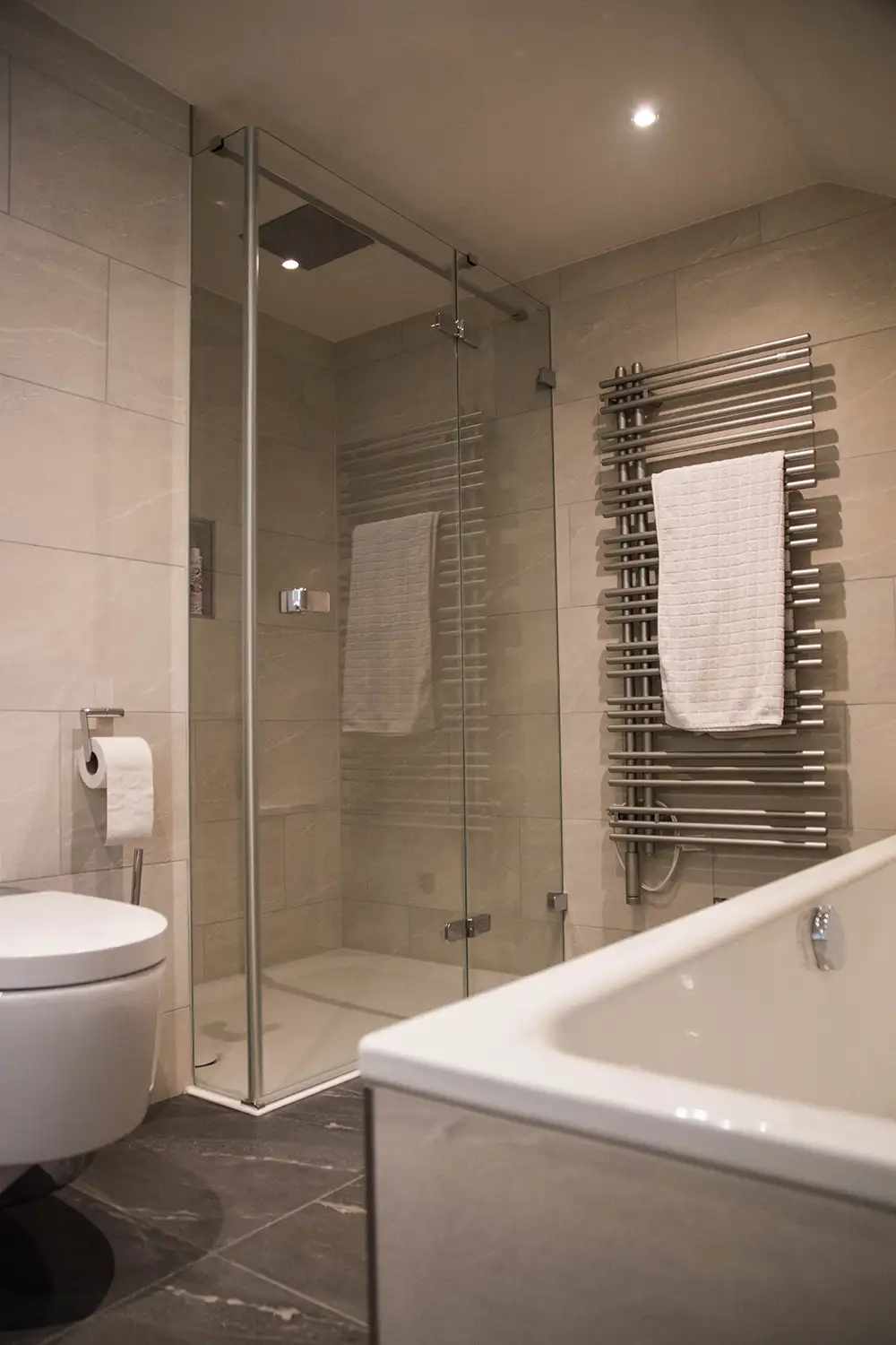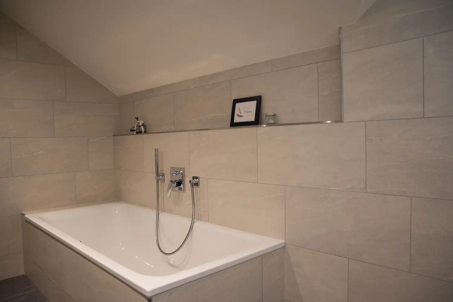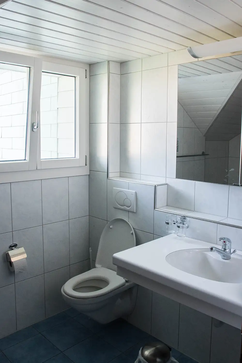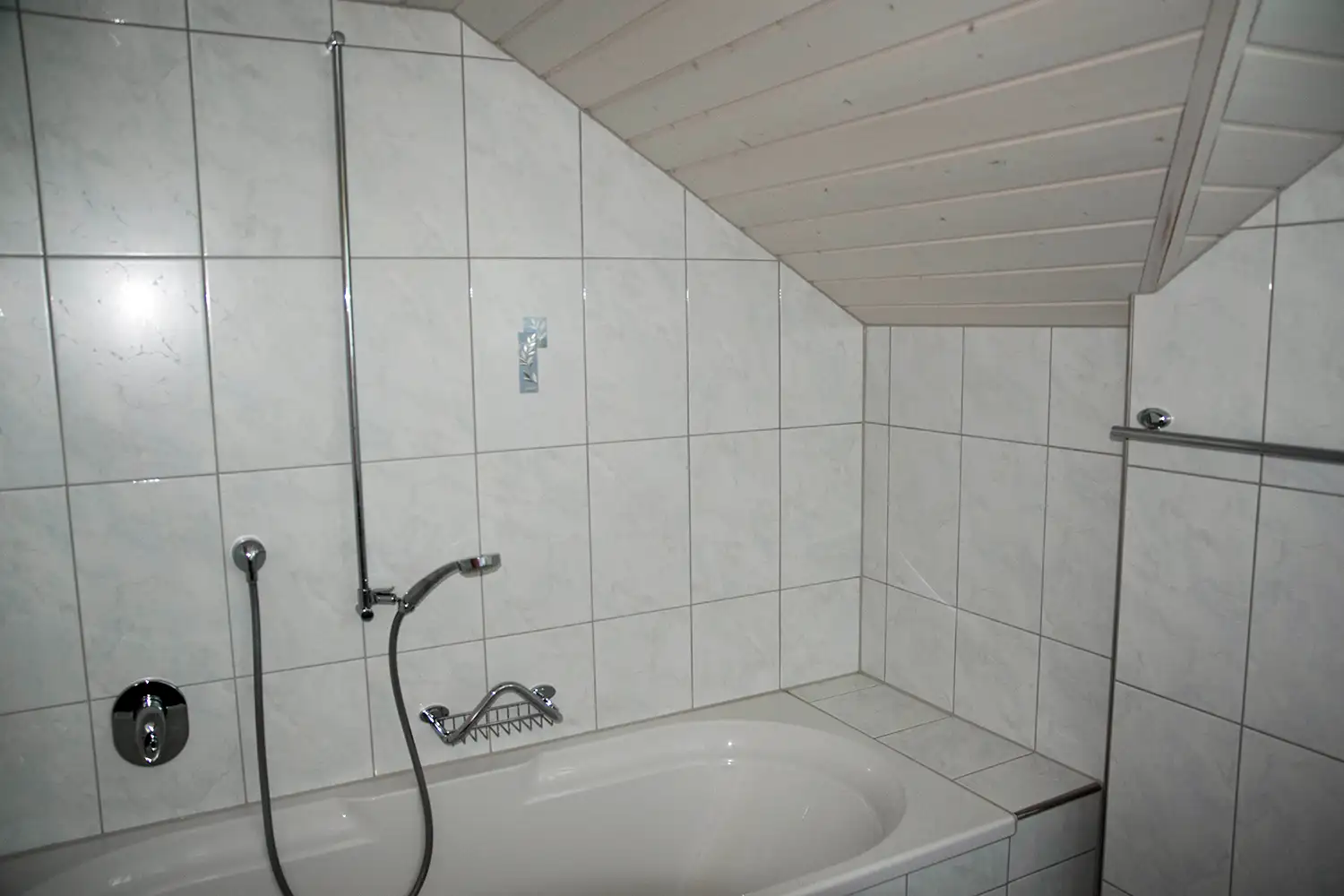Dieses bestehende Badezimmer wurde nicht nur erneuert sondern gleich auch vergrössert, so dass es neu auch eine Dusche neben der Badewanne enthält. Der Deckenaufbau mit Lehmbauplatten und Lehmputz fördert einen natürlichen Feuchteausgleich und führt zu einem besonderen angenehmen Raumklima.
