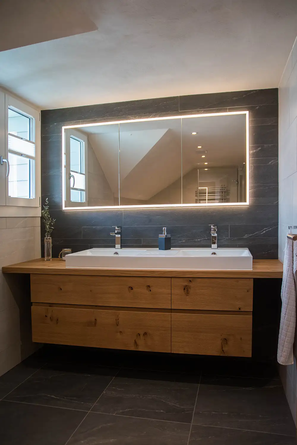 Das Highlight des Badezimmers bildet die Waschtischanlage mit UP-Spiegelschrank und dem Doppelwaschtisch auf einem massangefertigten Unterbau aus Massivholz Eiche.